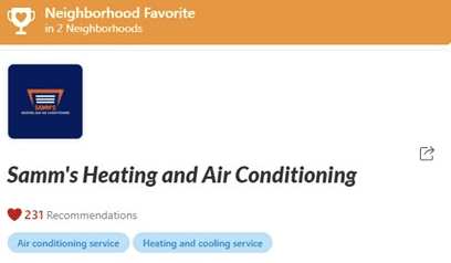 It’s great to see that Samm’s Heating & Air already has a local advantage here - recommended 231 times and a Neighborhood Favorite in TWO Neighborhoods!