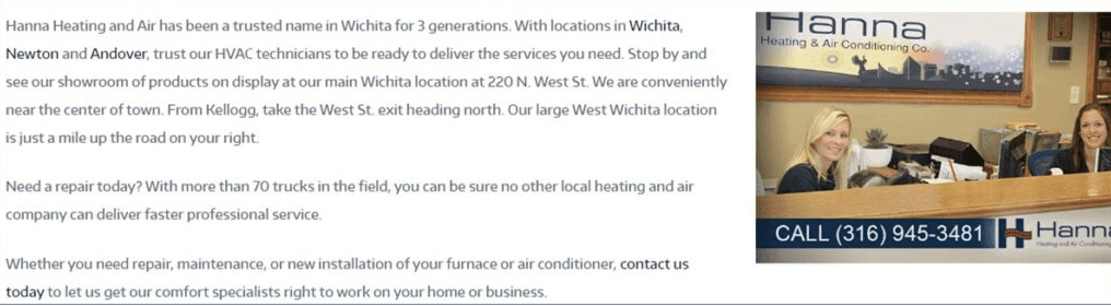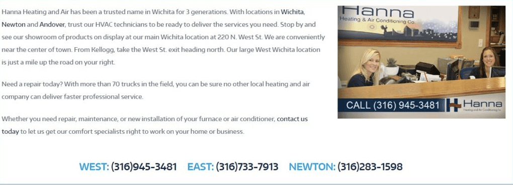 Here is an example of what we did on the bottom of a homepage (below the Google map) with one of our HVAC clients – Hanna Heating and Air Conditioning. It is inviting with the message and the image of their friendly front desk staff.