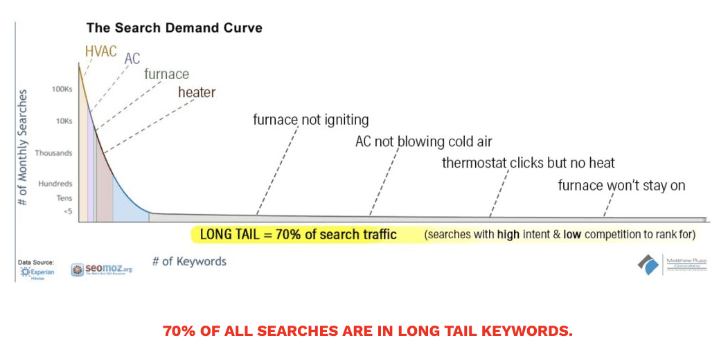 The term “hvac” or “air conditioning” likely gets searched thousands of times a month in the Plano area, but this is the OPPOSITE of a long tail search. These short search terms are very general and get a LOT of searches.
