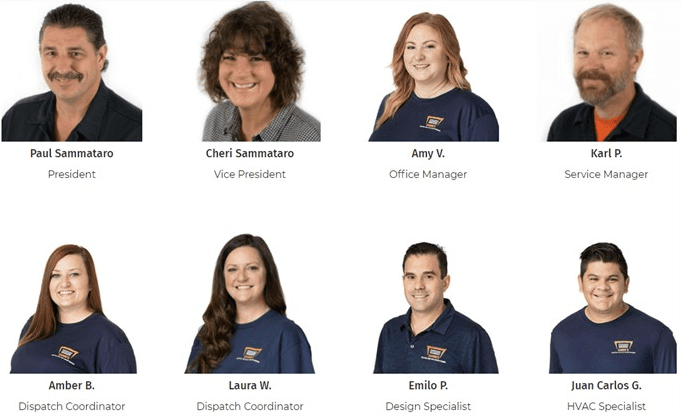 Your Meet our Team page is excellent. It gives people a good look at who runs the business and the technicians they might be letting into their homes. This page would be easily improved by adding a little bio about each person.