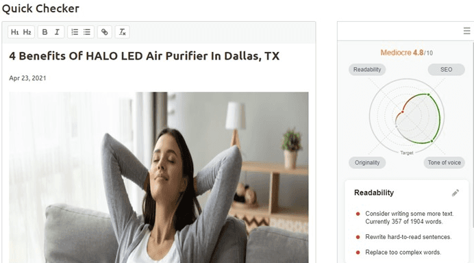 Using a software program to analyze how Google sees a particular page, we looked at how well your current blog post rates for people searching “air purifier.”