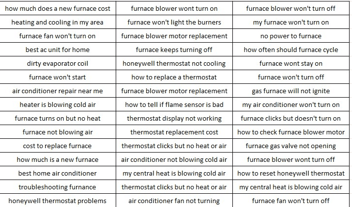 The trouble is this search term shows zero intent and not where most people will start their search on Google. Instead, most people will start their search with trying to solve THEIR problem, “My furnace is clicking”, “my AC is frozen up”, “my furnace is blowing cool air” – this is where we want to find them – while they are still trying to solve their problem!
