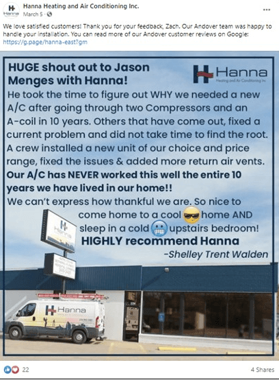 When you have people engaging with your posts, you might find yourself having 22 people like and 4 people SHARE a glowing review you post on Facebook, just like this recent example for one of our clients.
